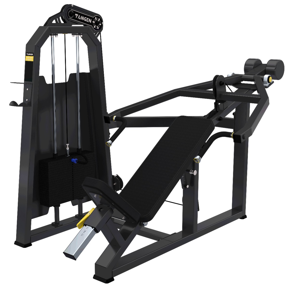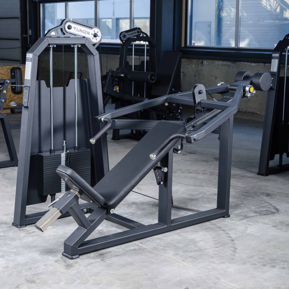 Профессиональный тренажёр TANGEN A2013 Наклонный грудной жим предназначен для изолированной тренировки верхней части грудных мышц. Дополнительно в работу вовлекаются передние пучки дельтовидных мышц и трицепсы. Конструкция тренажёра формирует стабильную и анатомически выверенную траекторию жима, обеспечивая безопасную и эффективную работу с отягощением.