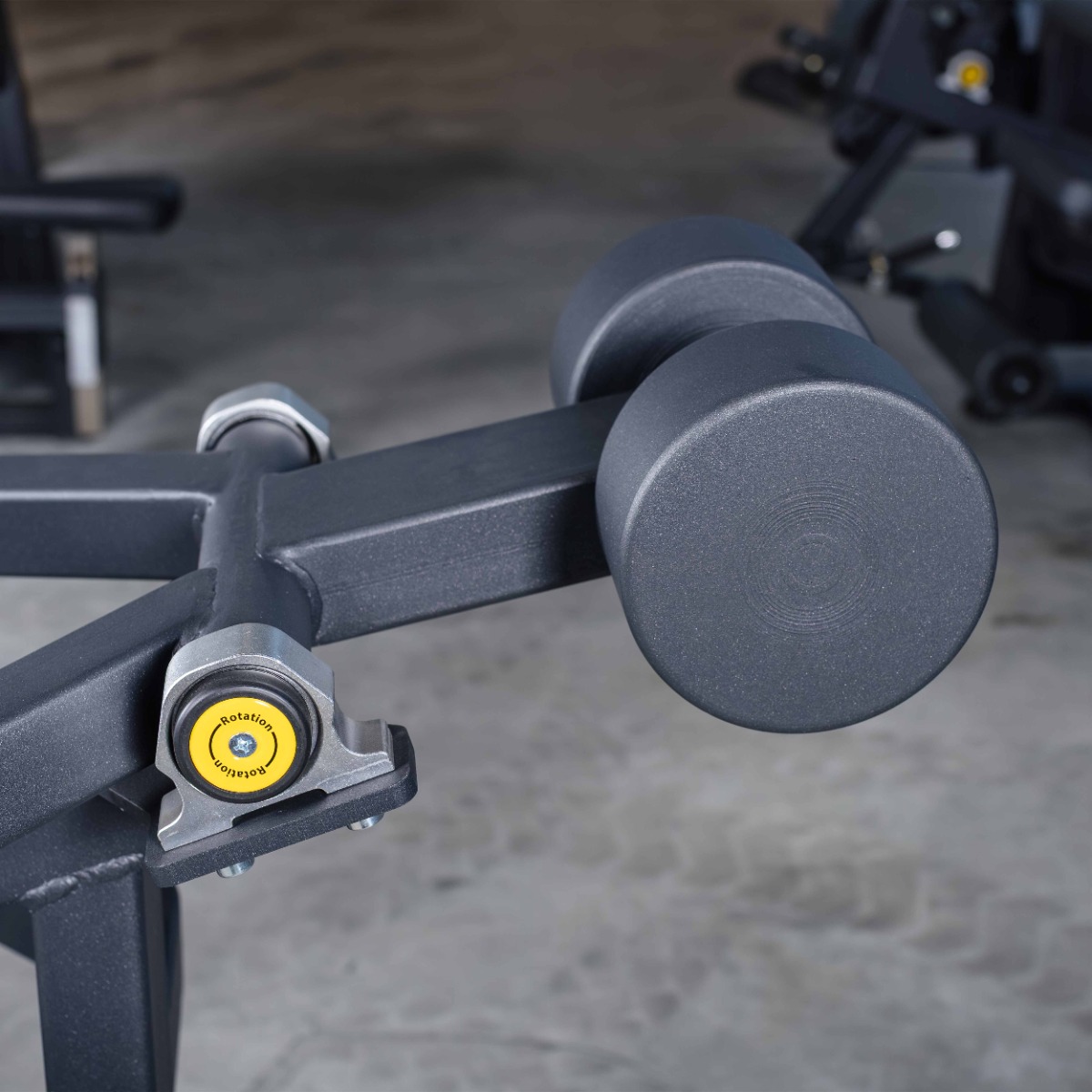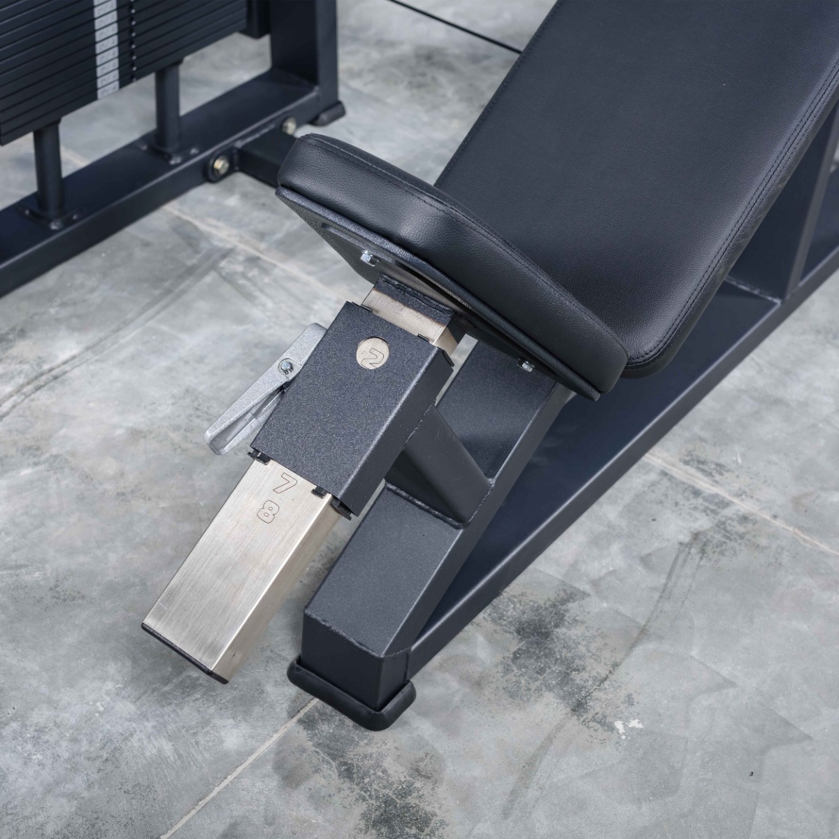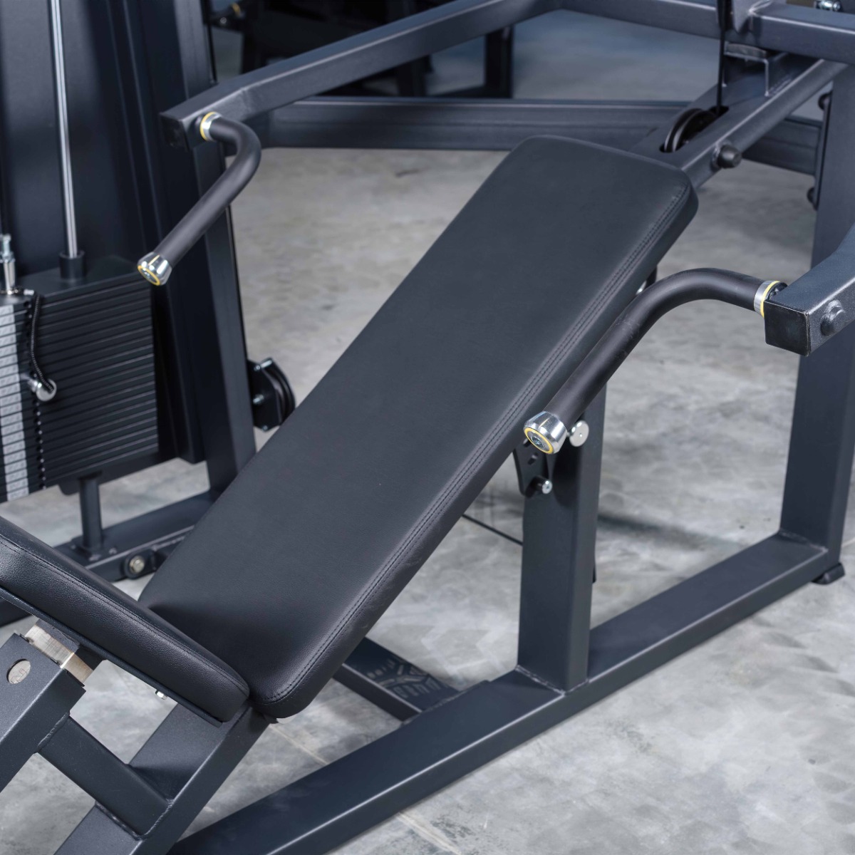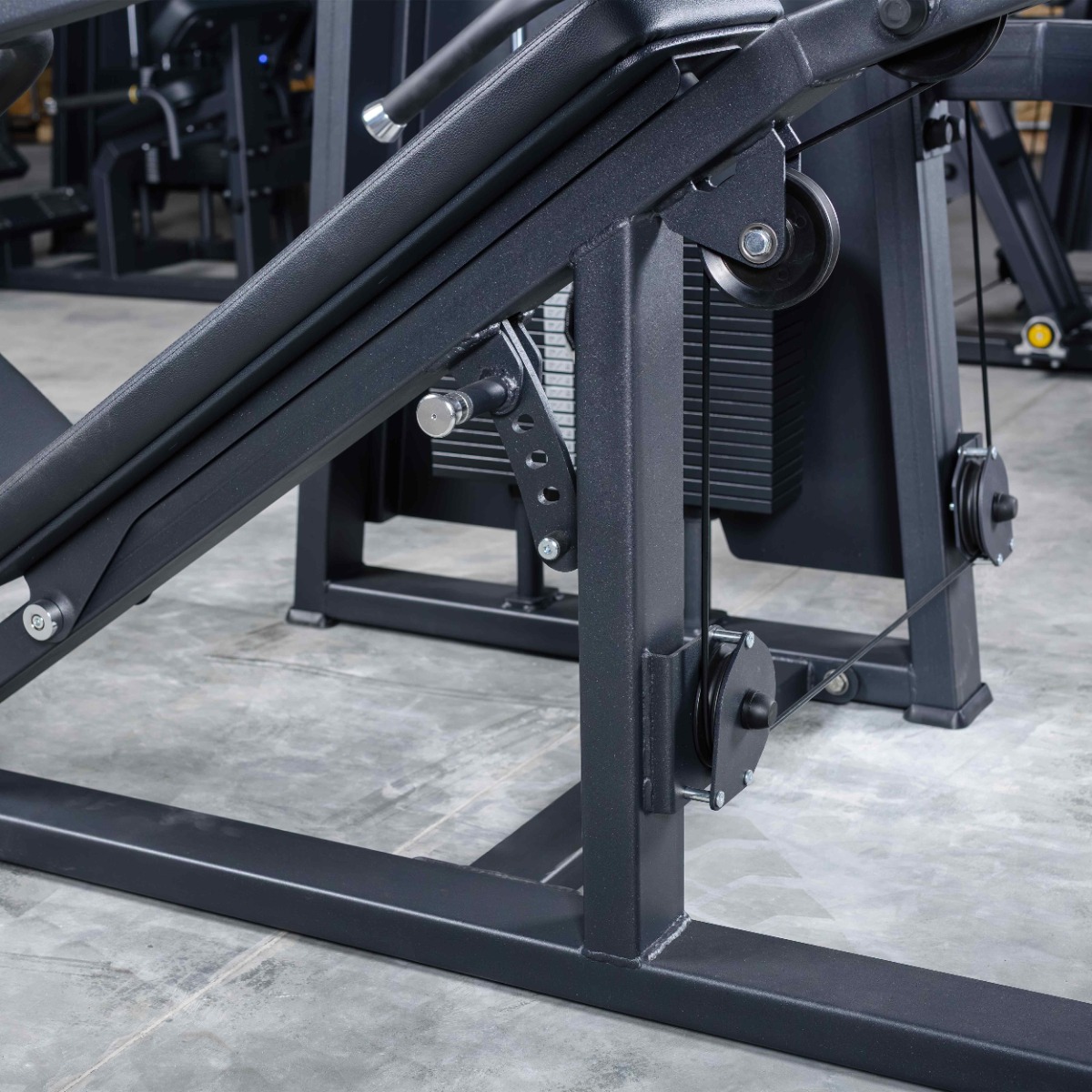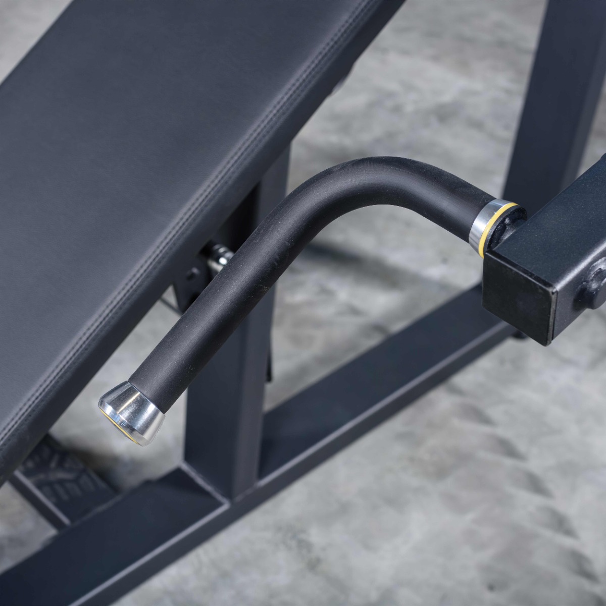 Геометрия сиденья, спинки и рукоятей выполнена под выверенным углом, обеспечивающим акцентированную нагрузку на верхнюю часть грудных мышц и корректную биомеханику жима.