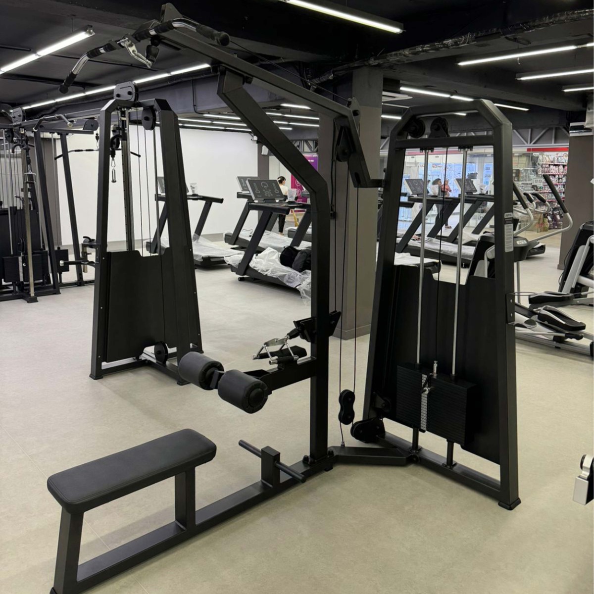Система нагрузки – тросовая, с весовым стеком 100 кг. Весовой стек выполнен из стальных плит с порошковым покрытием.