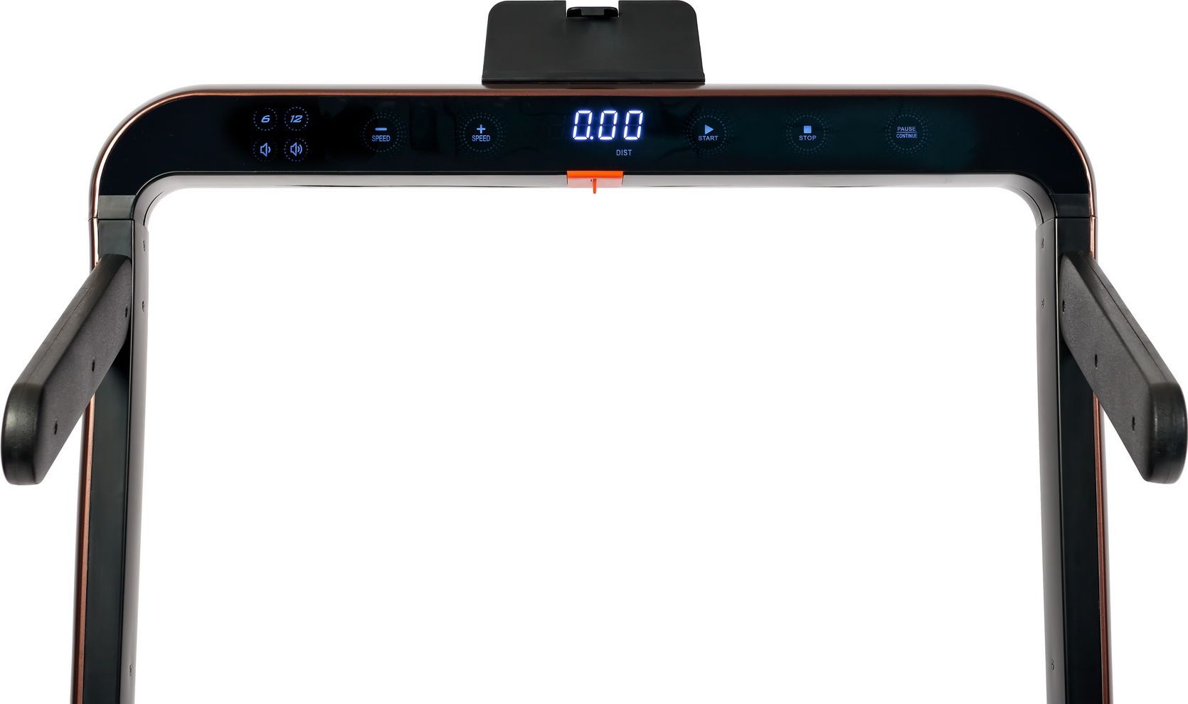 Высокотехнологичные беговые дорожки от немецкого бренда Titanium – это уникальное сочетание передовых технологий, функционала, качества и дизайна. Вся разработка продукта, от изначальной концепции и инжиниринга до биомеханического тестирования и систем контроля качества, проведена головным подразделением компании, расположенным в немецком Гендельберге. Здесь же созданы и дизайны различных серий, в основе которых лежит лаконичность и удобство использования. Вся продукция Titanium выполнена с традиционной немецкой педантичностью и внимательностью к деталям. Titanium Masters Slimtech C20 (Coffee) относится к классу компактных беговых дорожек последнего поколения и по своим характеристикам ориентирована на пользователей продвинутого и профессионального уровня. В ней реализованы сразу несколько передовых решений – от конструкции рамы и технических характеристик до дизайна и цветовых решений. При создании рамы Slimtech C20 инженеры Titanium руководствовались тремя соображениями – компактностью, трансформируемостью и безопасностью. Компактность – это, в первую очередь, удобство хранения. Толщина беговой дорожки в сложенном виде составляет уникальные 13 см, ее можно положить под кровать, в кладовку или любое иное место с ограниченным пространством. Трансформируемость, напрямую связанная с безопасностью, позволяет использовать Slimtech C20 в трех различных модификациях. В первом случае это полная сборка с поручнями, и тут дорожка внешне и функционально больше похожа на классический вариант тренажера. Этот вариант подойдет тем, кому важно сохранять максимальную устойчивость и безопасность при занятиях – к примеру, людям пожилого возраста. Также такая сборка предпочтительна для тех, кто тренируется на скоростях больше 10 км/ч – рукоятки всегда подстрахуют при потере равновесия. Второй вариант сборки похож на первый, но без поручней. Он реализует все возможности Slimtech C20 в плане компактного хранения – в этом режиме дорожка складывается до 13 см по толщине. Если у тренажера нет стационарного места для тренировки и его нужно хранить в максимально компактном состоянии – этот вариант как раз для этого. При этом стойка консоли по-прежнему находится в вертикальном положении и подстрахует на случай потери равновесия. Механизм складывания прост в использовании и позволяет собрать или разобрать тренажер за несколько секунд, а само перемещение осуществляется при помощи 2-х транспортировочных роликов. Последний вариант сборки – стойка консоли находится в горизонтальном положении на одном уровне с рамой. В этом случае дорожка не требует вообще никаких физических манипуляций. Это вариант наименее безопасный, предназначен исключительно для ходьбы и ограничен максимальной скоростью в 4 км/ч. Для управления в этом режиме используется пульт дистанционного управления. Форм-фактор, в котором выполнена Titanium Masters Slimtech C20 – это не только совершенство технологий, но и выразительный дизайн в стиле кинетического хай-тека. Лаконичный внешний вид с закругленными формами создает ощущение премиального продукта, который гармонично вписывается в любые интерьеры, включая самые изысканные и дорогие. Дополняют форм-фактор специальные цвета окраски – более спокойный коричневый кофейного оттенка и выразительный синий. По своим характеристикам Slimtech C20 ориентирована на пользо