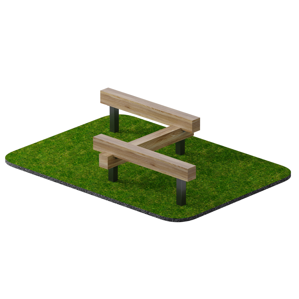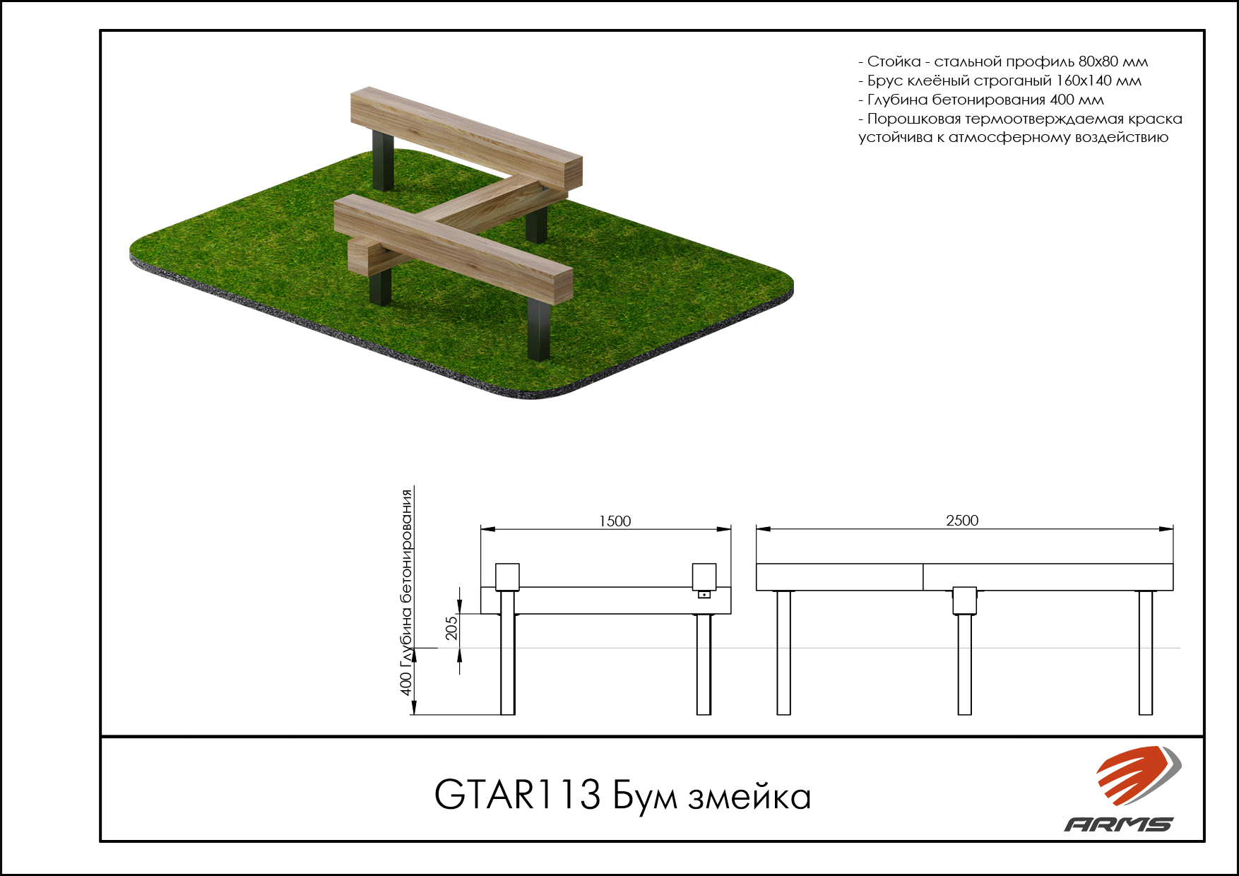 Элемент полосы препятствий «Бум змейка» представляет собой деревянный бум, закрепленный на высоте 0,2 м от земли на стальных стойках и образующий ломаную ступенчатую линию.