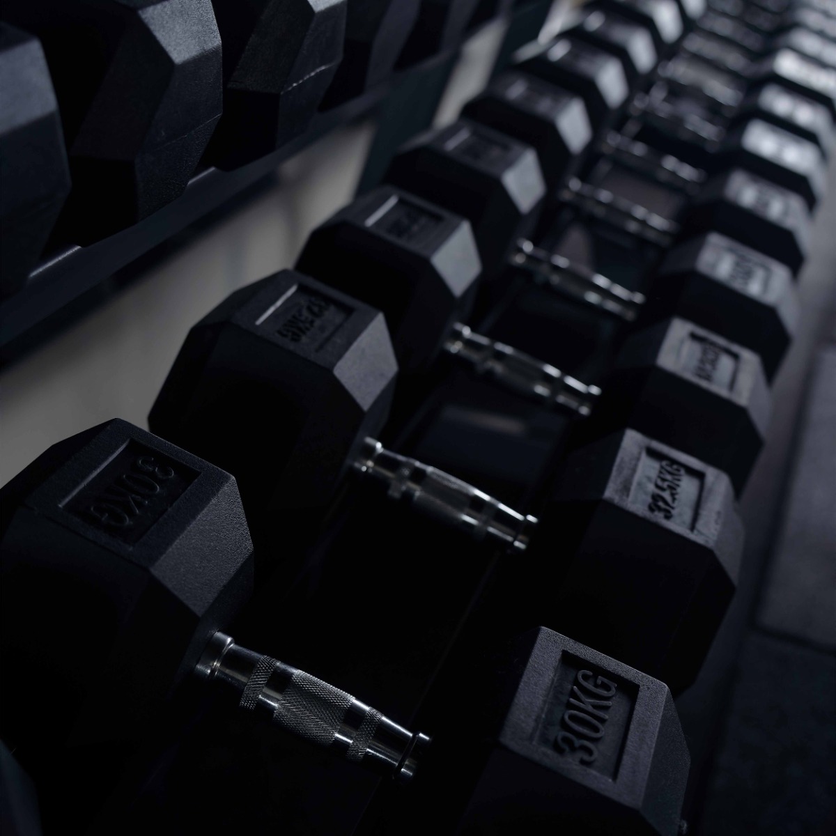 Шестиугольные грузы гантели, обеспечивающие устойчивое положение на любой поверхности, изготовлены из цельного металла.