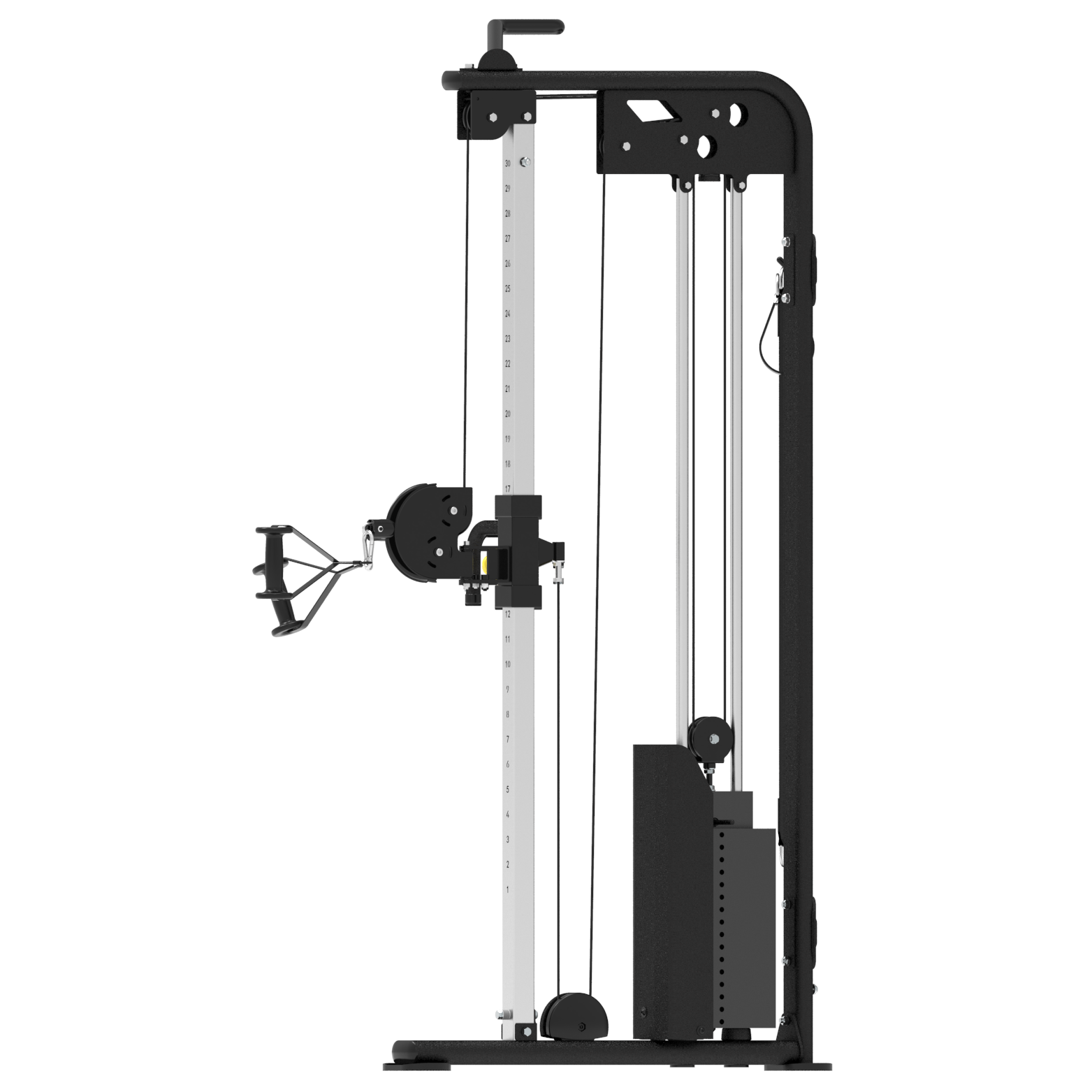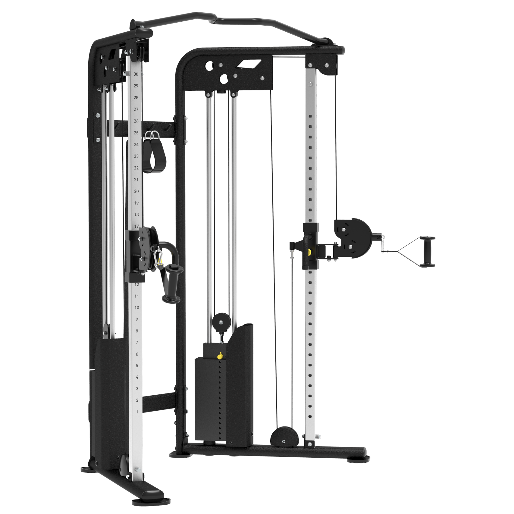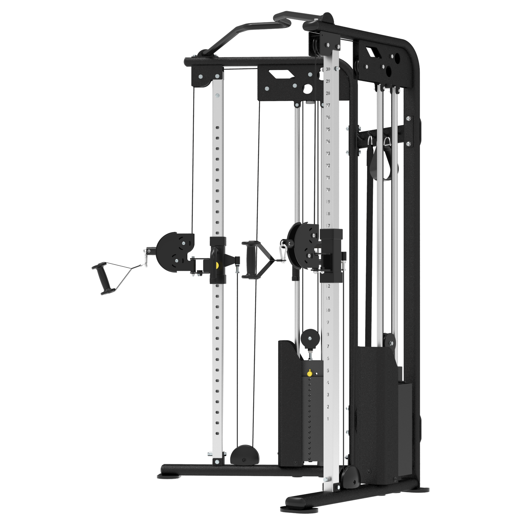 - Каждая стойка имеет 31 положение для фиксации тяговых блоков, что предоставляет практически безграничный выбор упражнений.