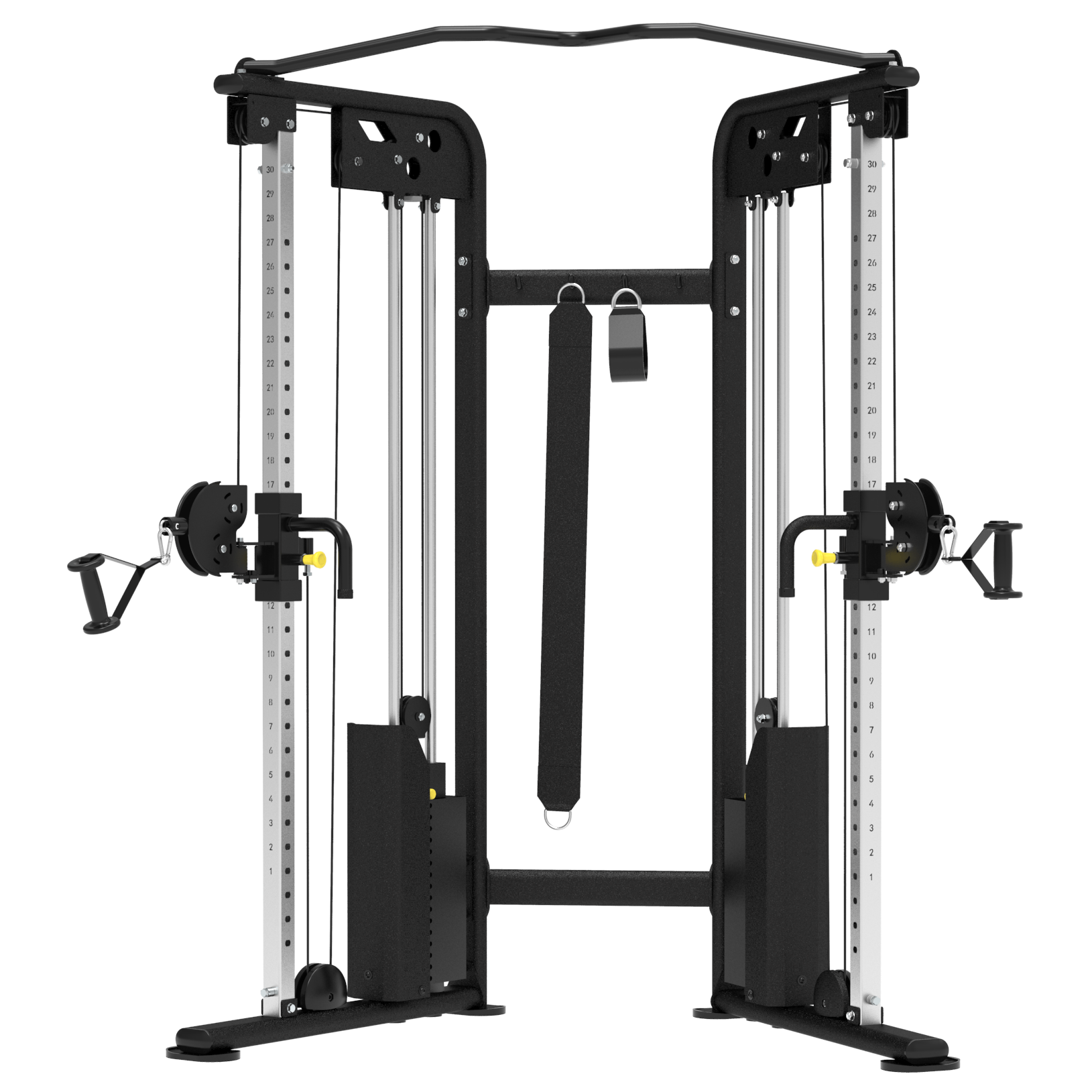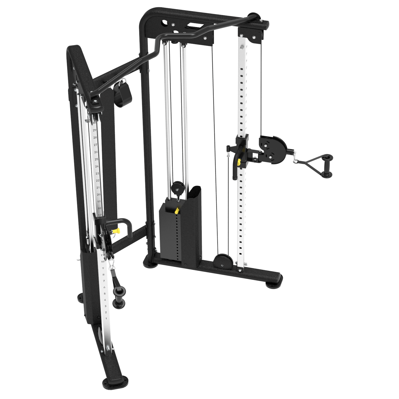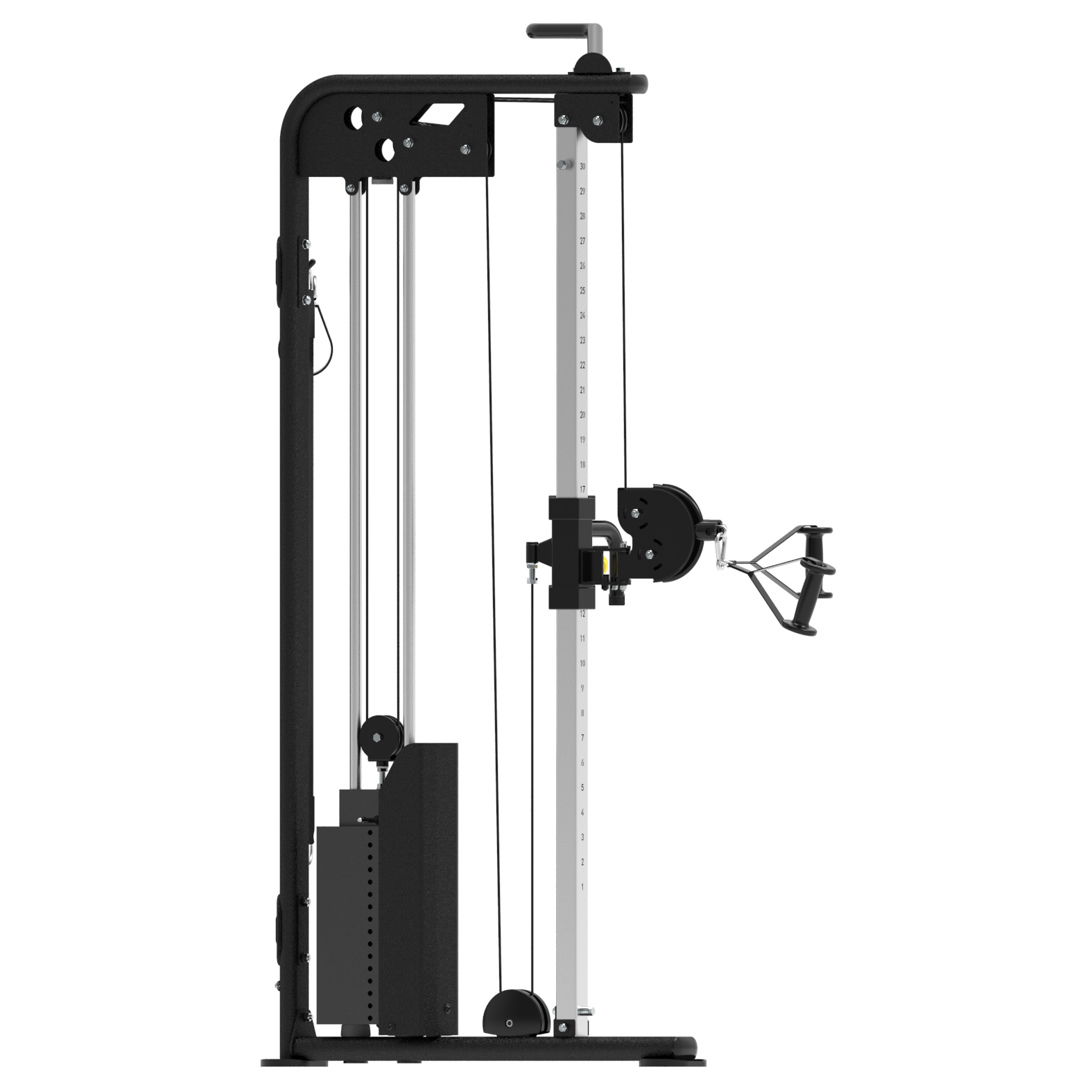 - Каждая стойка имеет 31 положение для фиксации тяговых блоков, что предоставляет практически безграничный выбор упражнений.