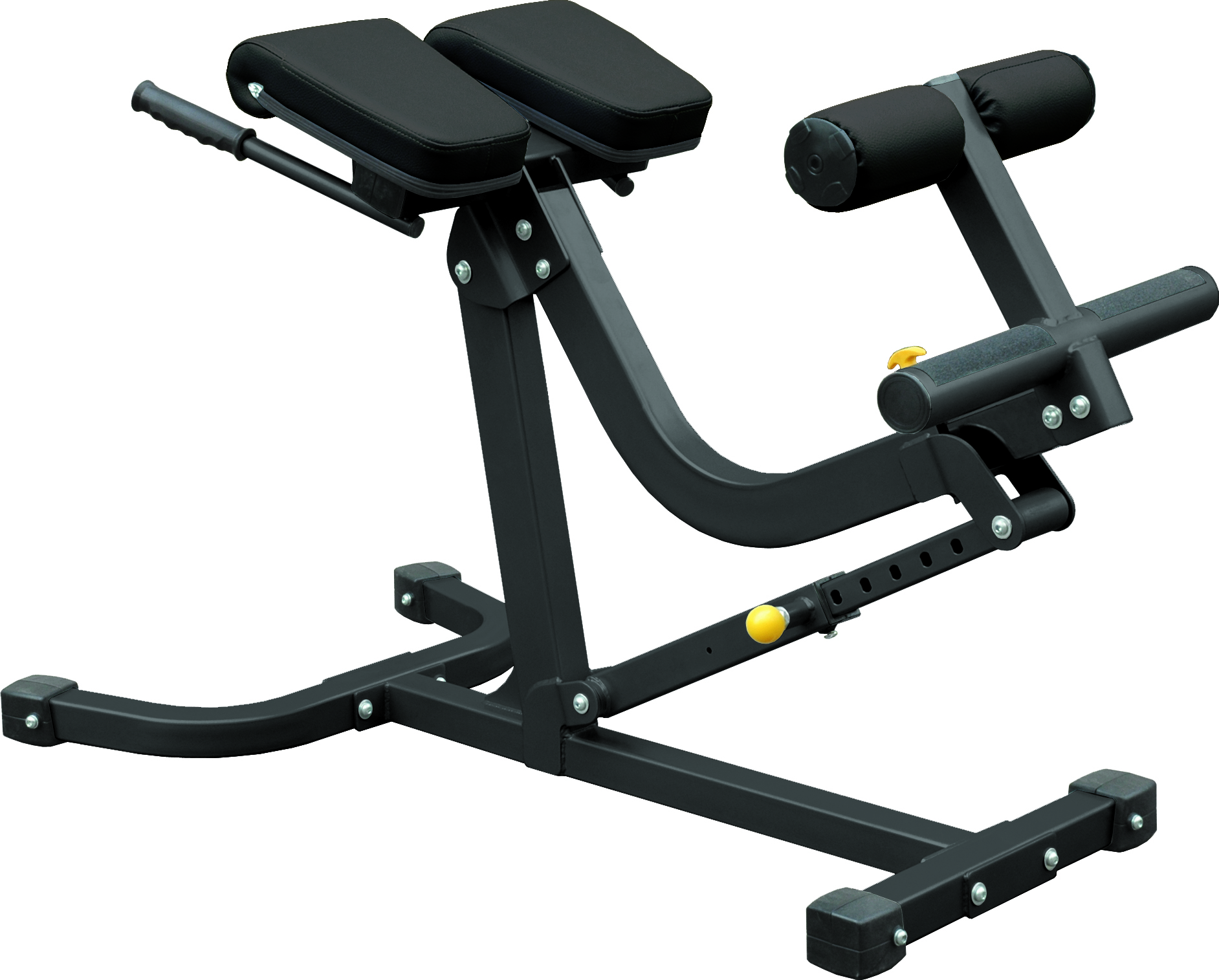 - Благодаря широкому диапазону регулировки положения валиков для ног, атлет может варьировать положение тела от 45 до 90 градусов, тем самым прорабатывать как мышцы пресса, так и спины.