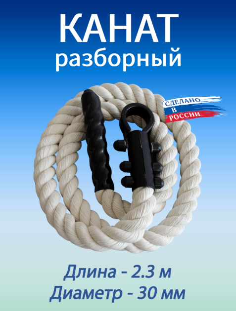 Канат для лазания Канат спортивный Общая информация: Тренировочный канат для лазания. Для зала и занятий на свежем воздухе. Подходит для спортивных игр и организации досуга. Лазание по канату - это базовое упражнение, которое воздействует на группы мышц и связок, и укрепляют организм в целом. А именно общее развитие приносит наибольшую пользу для организма. Особенности и характеристики: материал - х/б, максимальная нагрузка - 80 кг, длина - 2.3 м, диаметр - 30 мм, крепление - разборное, цвет - белый.