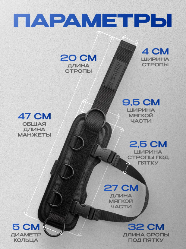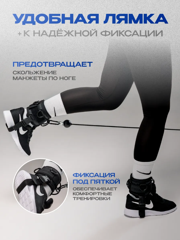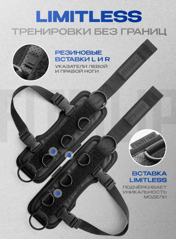 Манжеты на ноги FITFILIP LIMITLESS — профессиональный аксессуар для тренировок, который помогает эффективно развивать мышцы ног и ягодиц дома, в зале и на улице. Преимущества модели: Универсальность: подходят как манжета на щиколотку для тренировки ног в тренажёрном зале, так и для домашних тренировок с эспандерами, фитнес-резинками и подвесными системами. Совместимость с оборудованием: манжеты для эспандеров и манжеты для кроссовера идеально подходят для упражнений типа тяга тренажёра на блочных системах. Фирменная фиксация Limitless: анатомический вырез и манжеты с ремнём для пятки обеспечивают плотную посадку без смещения при любых движениях. Комфорт премиум-уровня: мягкая перфорированная подкладка, амортизирующий слой и резиновые вставки с массажным эффектом исключают натирания. Прочность и надёжность: усиленные швы, сварные металлические кольца, крепкие застёжки Fast Lock и липучка Velcro A+ делают каждую силовую манжету устойчивой к интенсивным нагрузкам. Удобство в использовании: 3 дополнительных полукольца для смены направления тяги без снятия, съёмные лямки, маркировка L/R для быстрой ориентации. Разнообразие применения: могут использоваться как ЛФК манжеты для реабилитации и восстановления, так и как манжеты для функционального тренинга. Компактность: лёгкие и мобильные ankle strap легко поместятся в спортивную сумку.