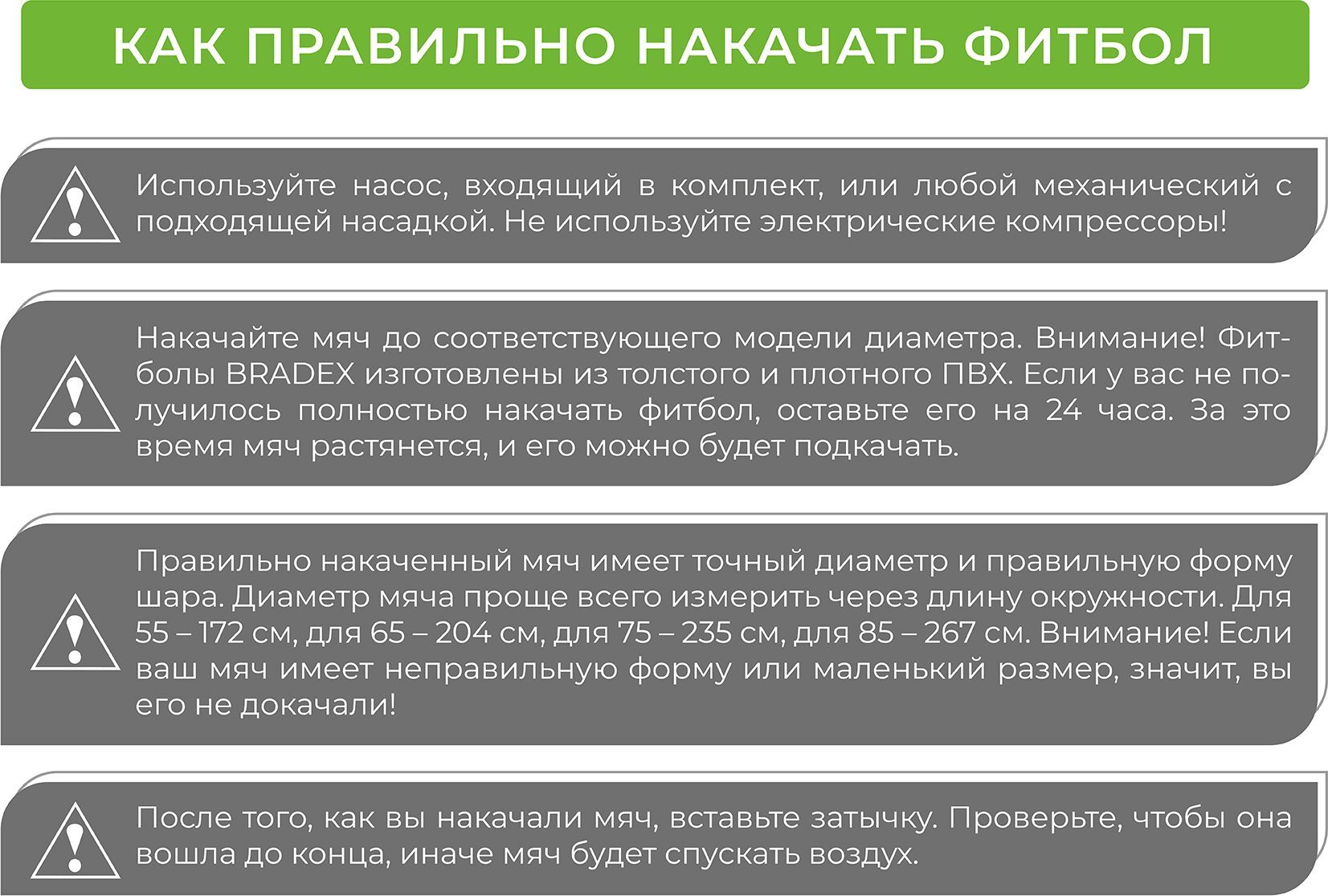 Фитбол , выдерживающий нагрузку до 120 кг, тренирует пресс, бёдра и ягодицы, развивает силу, гибкость, координацию и корректируюет осанку. Даже если Вы просто сидите на нём, то всё равно происходит напряжение разных групп мускул, и единственным условием является сохранение совершенно ровной спины во время выполнения упражнения. Фитбол идеален для занятий аэробикой и во время прохождения реабилитационных комплексов упражнений; он может использоваться даже беременными женщинами, не отказавшимися от физических нагрузок. Рекомендации по подбору размера мяча: Рост менее 160 см – 55 см Рост более 160 см – 65 см Рост более 170 см – 75 см Рост более 185 см – 85 см