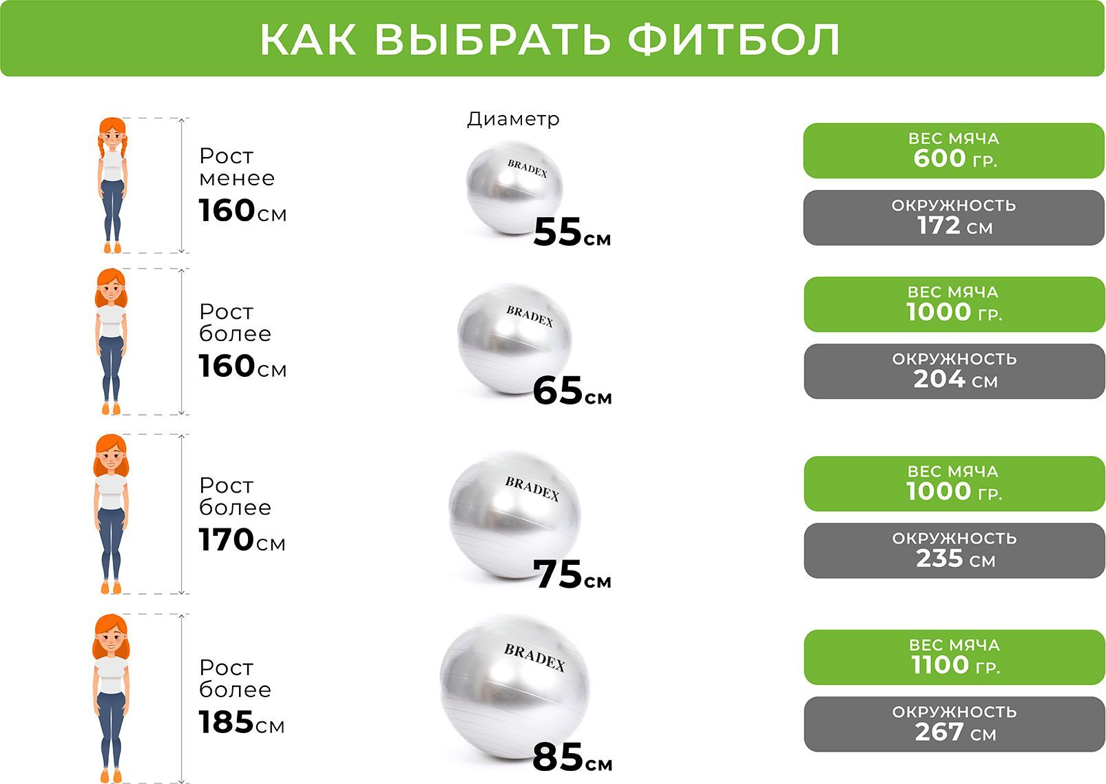 Способ применения подробно описан в инструкции Надуйте мяч при помощи насоса или компрессора для надувных кроватей. Рекомендации по подбору размера мяча: Рост менее 160 см – 55 см Рост более 160 см – 65 см Рост более 170 см – 75 см Рост более 185 см – 85 см