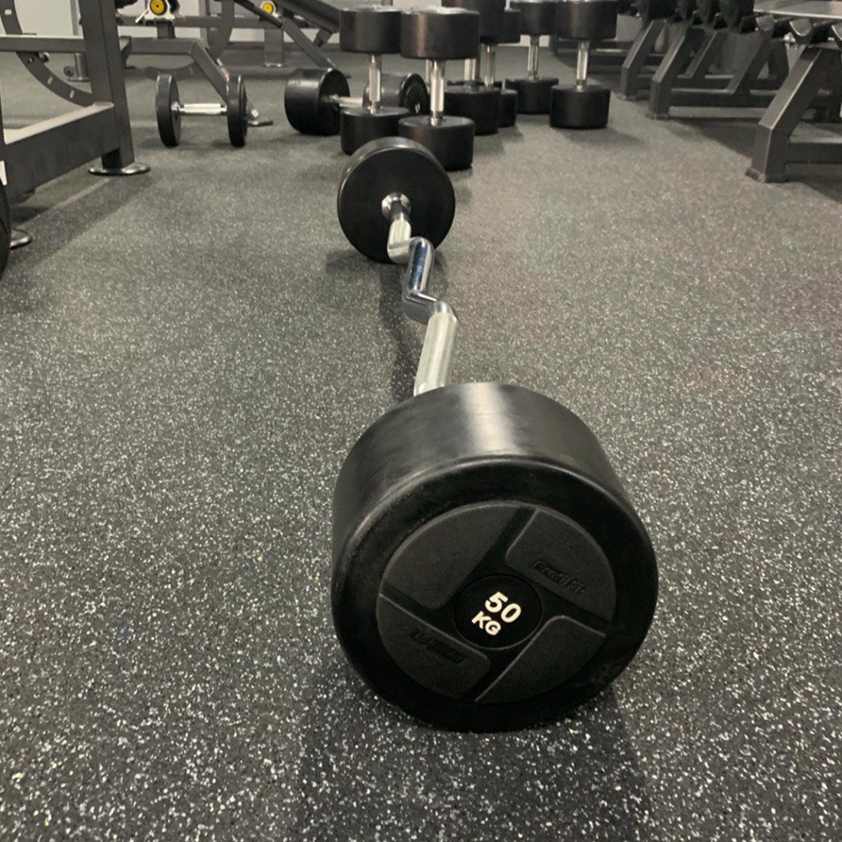 Изогнутый гриф, утяжеление выполнено из черных монолитных обрезиненных дисков,