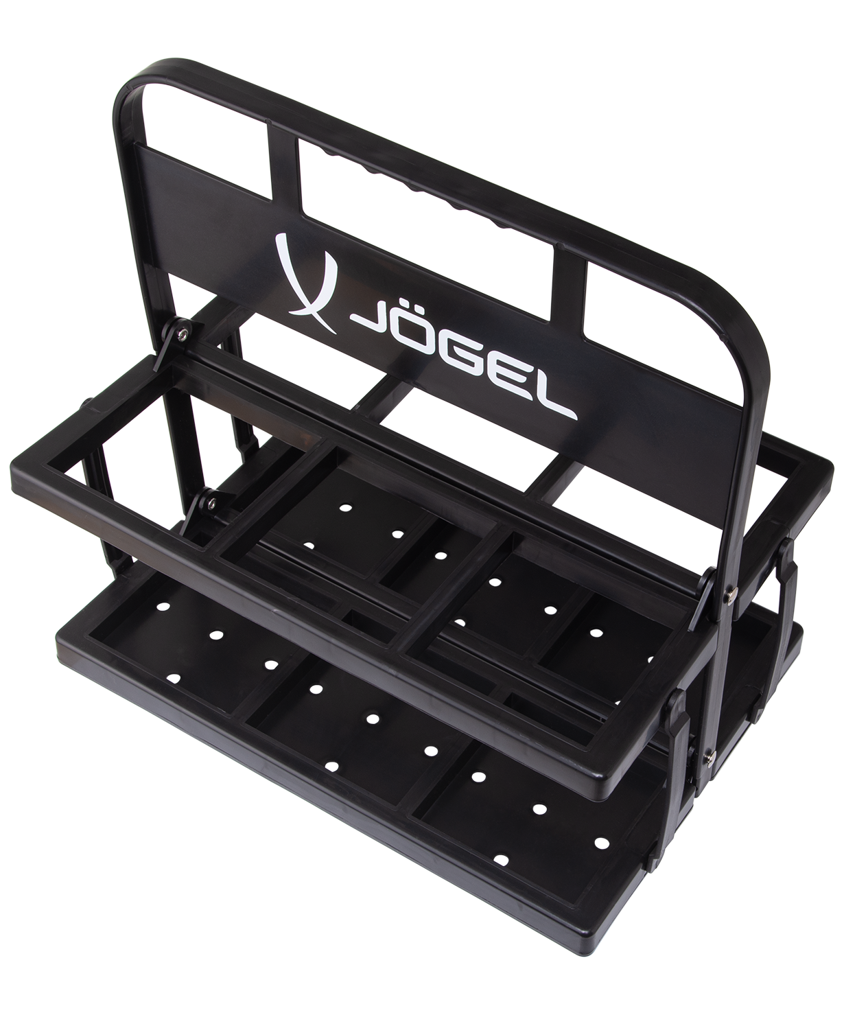 Складная пластиковая переноска для бутылок Jögel черного цвета изготовлена из прочного пластика. Вмещает 6 бутылок емкостью до 1 литра каждая. Незаменима во время сборов, тренировок и соревнований, позволяет удобно и компактно хранить спортивные аксессуары.\nдля 6 бутылок;\nудобная анатомическая ручка.\nХарактеристики:\nМатериал: полипропилен, ABS пластик\nЦвет: черный\nГабариты, см: 34 х 6,5 х 32,5\nВес, г: 610