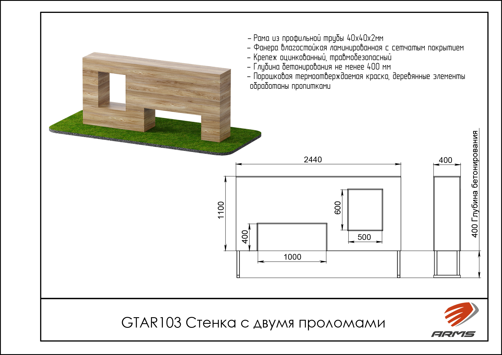 Элемент полосы препятствий «Стенка с двумя проломами» состоит из стального цельносварного каркаса обшитого влагостойкой фанерой.