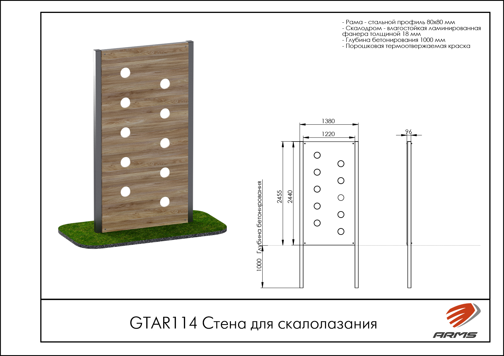 Элемент полосы препятствий «Стена для скалолазания» состоит из стального каркаса и влагостойкой фанеры с отверстиями для лазанья.