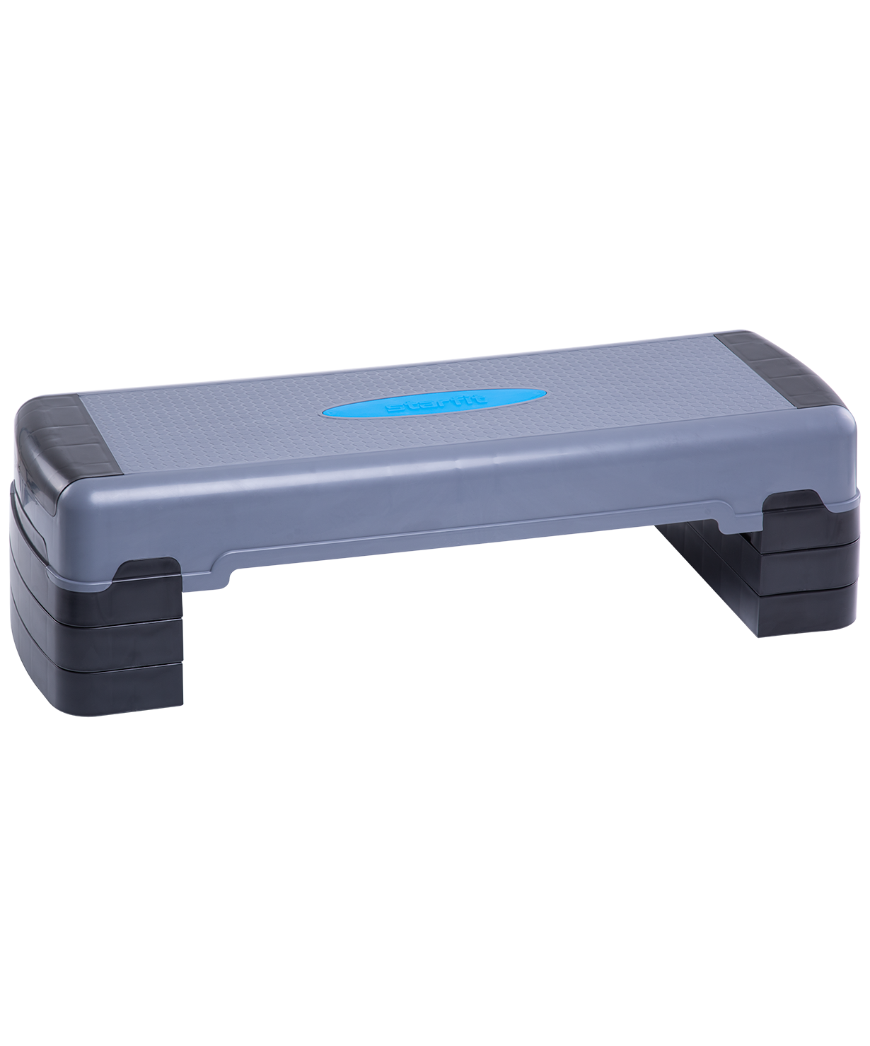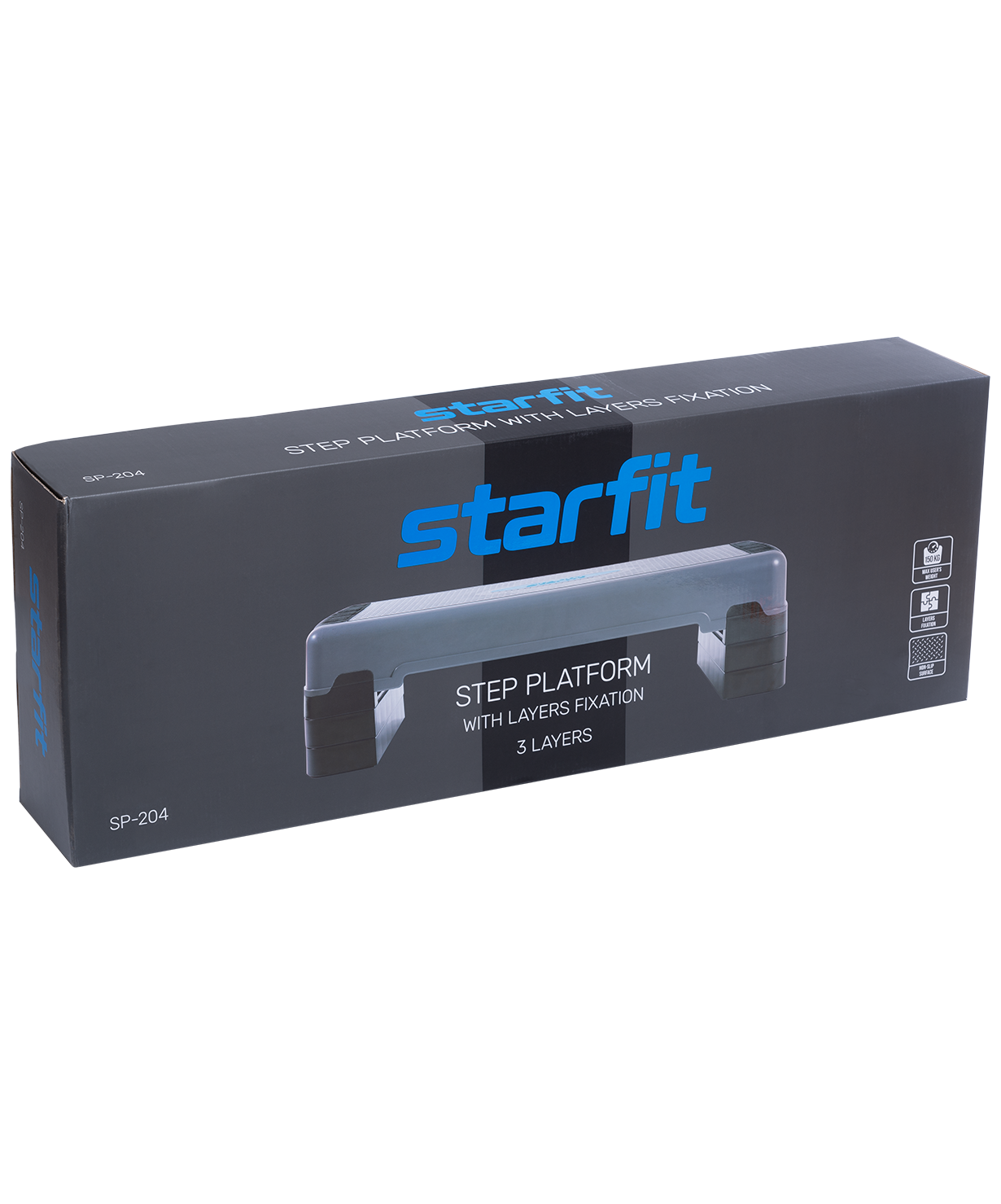 Трехуровневая степ-платформа SP-204 от STARFIT – многофункциональный спортивный инвентарь, который позволяет оптимизировать нагрузку на мышцы ног и ягодиц, сделать тело более подтянутыми и стройными. Этот кардиотренажер также способствует укреплению сердечно-сосудистой системы за счет высокоинтенсивных тренировок. Степ платформа - один из самых популярных аксессуаров в фитнесе. Ее используют как женщины, так и мужчины в функциональном тренинге, бодибилдинге и групповых программах. Такой тренажер для ходьбы дома компактный, поэтому он не займет много места в помещении. Степ платформа для фитнеса имеет нарезку на поверхности, которая обеспечивает отсутствие скольжения во время занятий. Увеличенная до 90 см длина изделия позволяет выполнять множество различных упражнений, вы также можете менять высоту модели с помощью подставок, входящих в комплект. Платформа для степа выполнена из прочного ПВХ и выдерживает нагрузку до 150 кг. Преимущества: Нескользкая поверхность; Прочная; 3 уровня. Характеристики: Количество уровней: 3 Материал: поливинилхлорид Длина, см: 90 Ширина, см: 32 Высота платформы с уровнями, см: 25 Высота первого уровня, см: 15 Высота каждой ступени, см: 5 Максимальный вес пользователя, кг: 150 Цвет: серый/синий/черный Тип упаковки: цветная коробка Количество в упаковке, шт: 1 Вес без упаковки, кг: 5,0 Производство: КНР