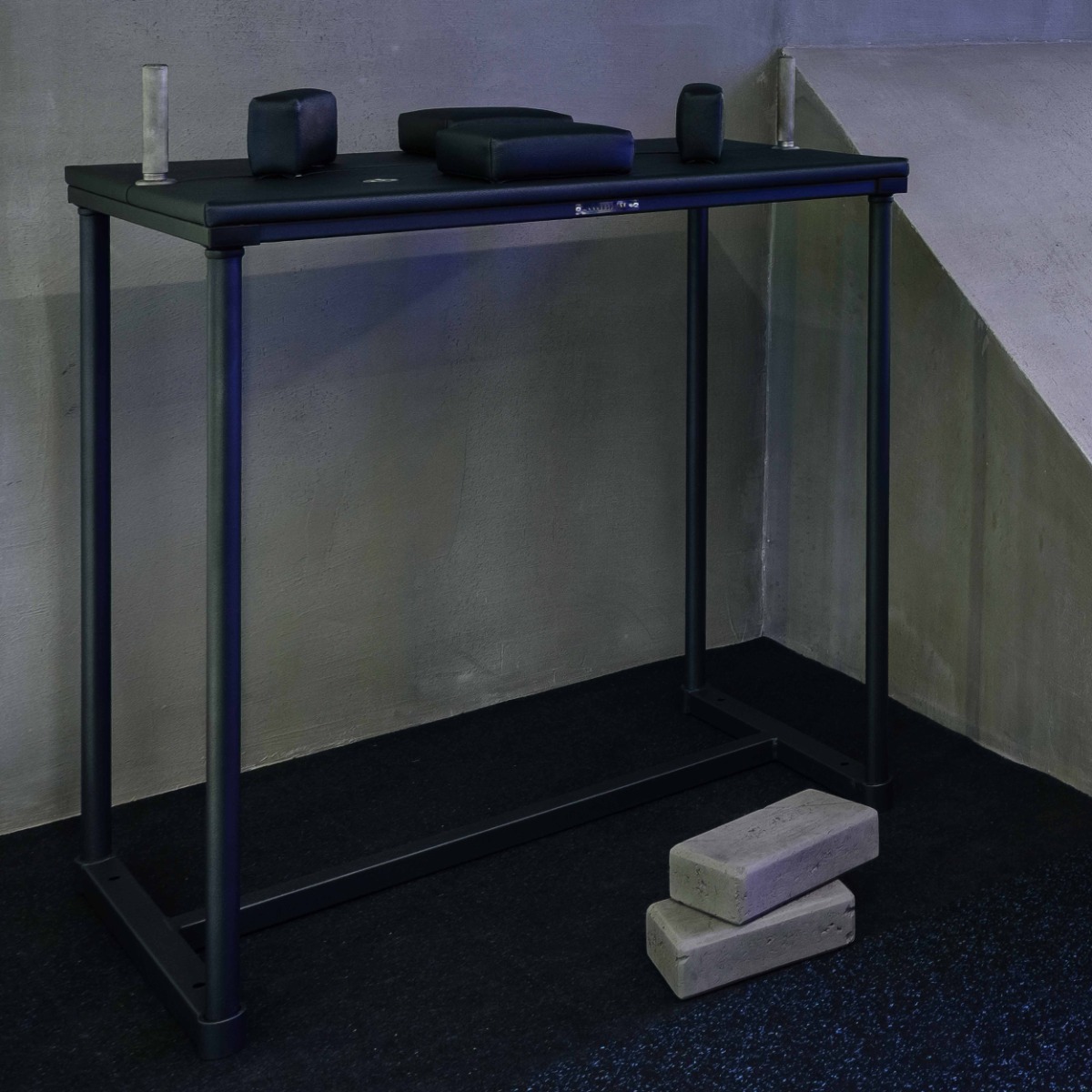 Подлокотник изготовлен таким образом, чтобы его края не имели закругленности Состоит из фанеры 15 мм и мягкой специальной подложки из вторично-вспененного полиуретана с обивкой двух-цветным кожзаменителем. Научно доказано, что борьба на асимметрических подлокотниках на много безопаснее, чем на параллельных.