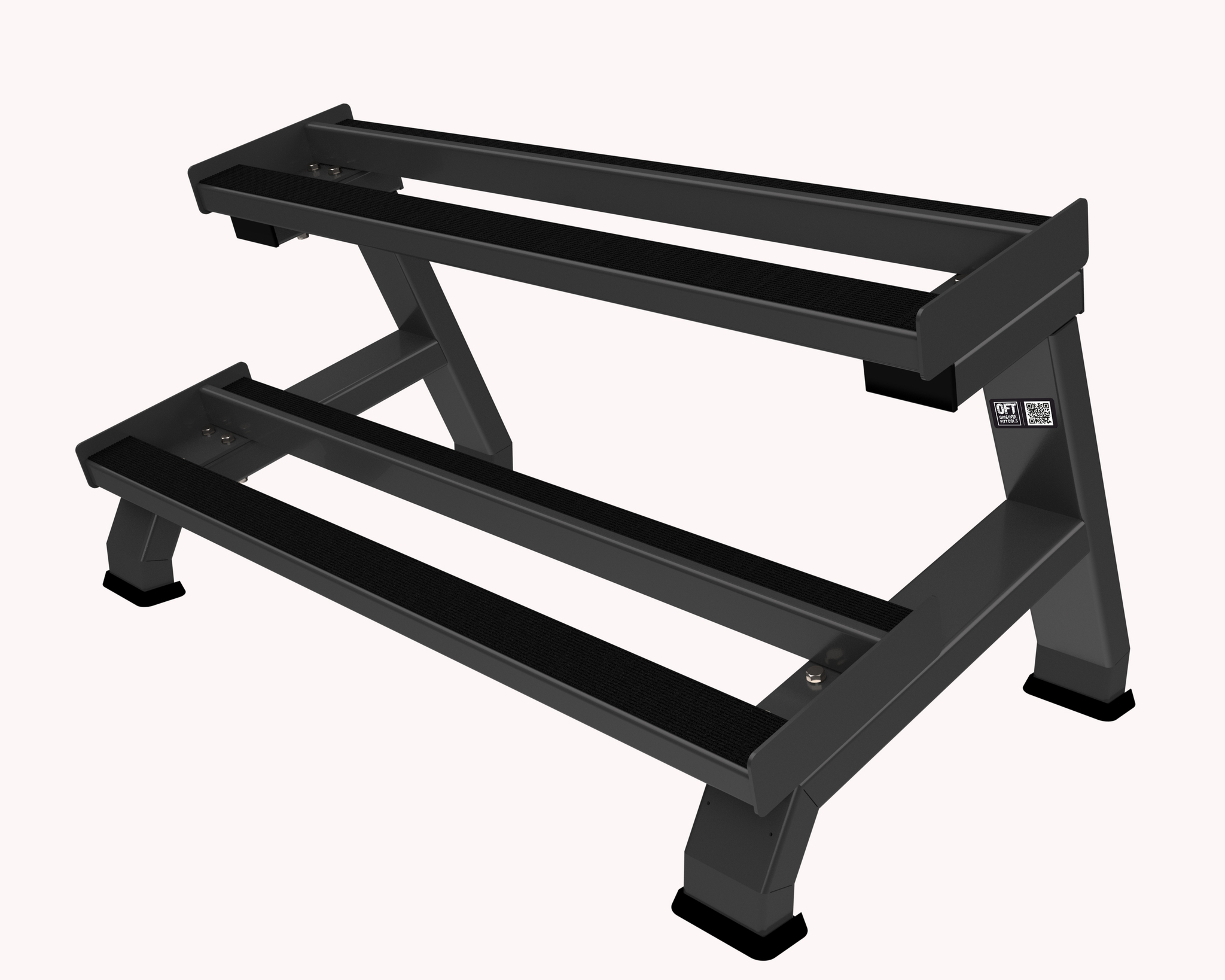 Стойка для гантелей двухъярусная на 10 пар Original FitTools FT-VDR-10 предназначена для хранения и удобного использования гексагональных гантелей, представляет собой сборную металлическую конструкцию с двумя полками.