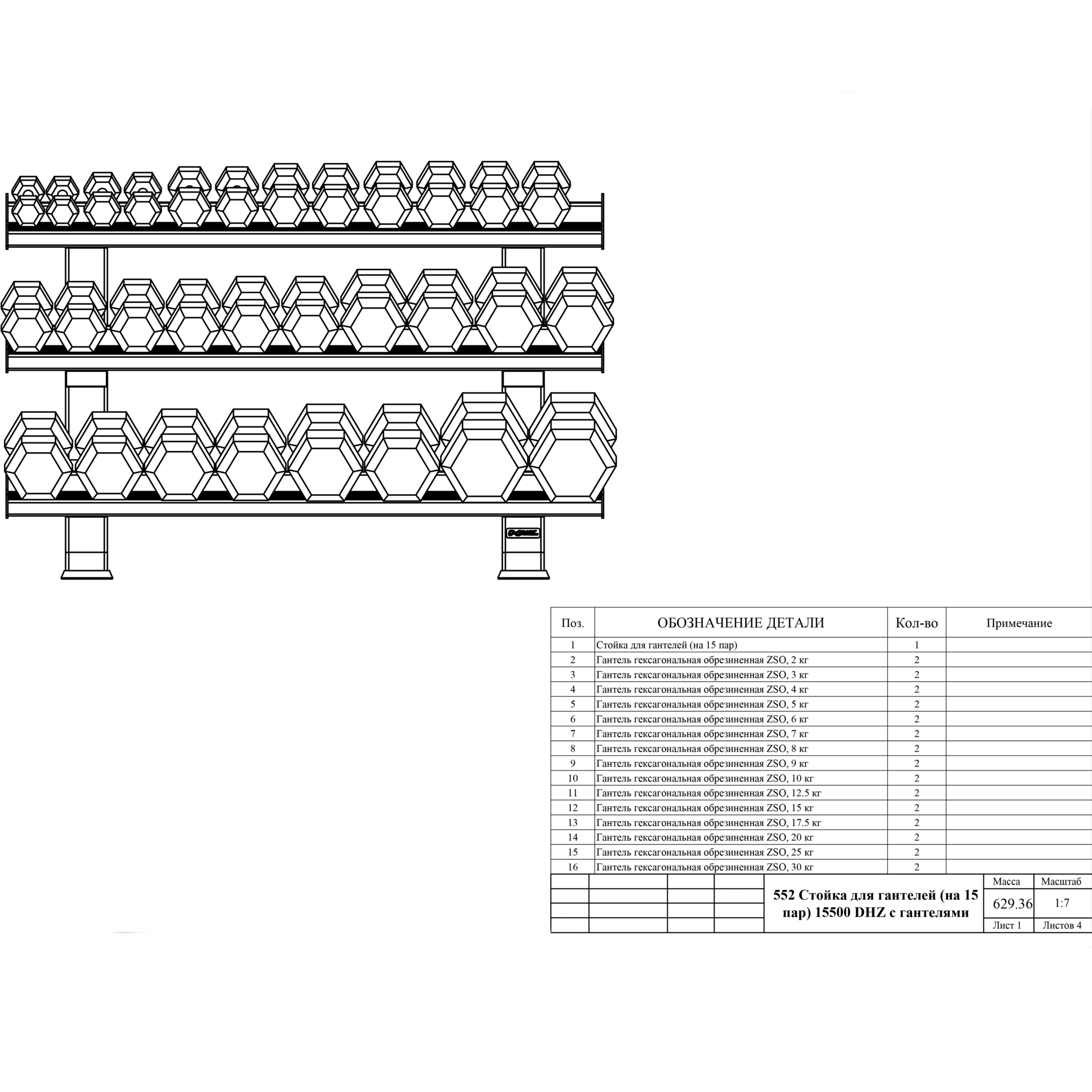 На стойке для гантелей можно разместить по паре гексагональных обрезиненных гантелей от 2 до 30 кг. Точное количество пар гантелей зависит от веса размещаемых гантелей. Максимальная нагрузка 500 кг.