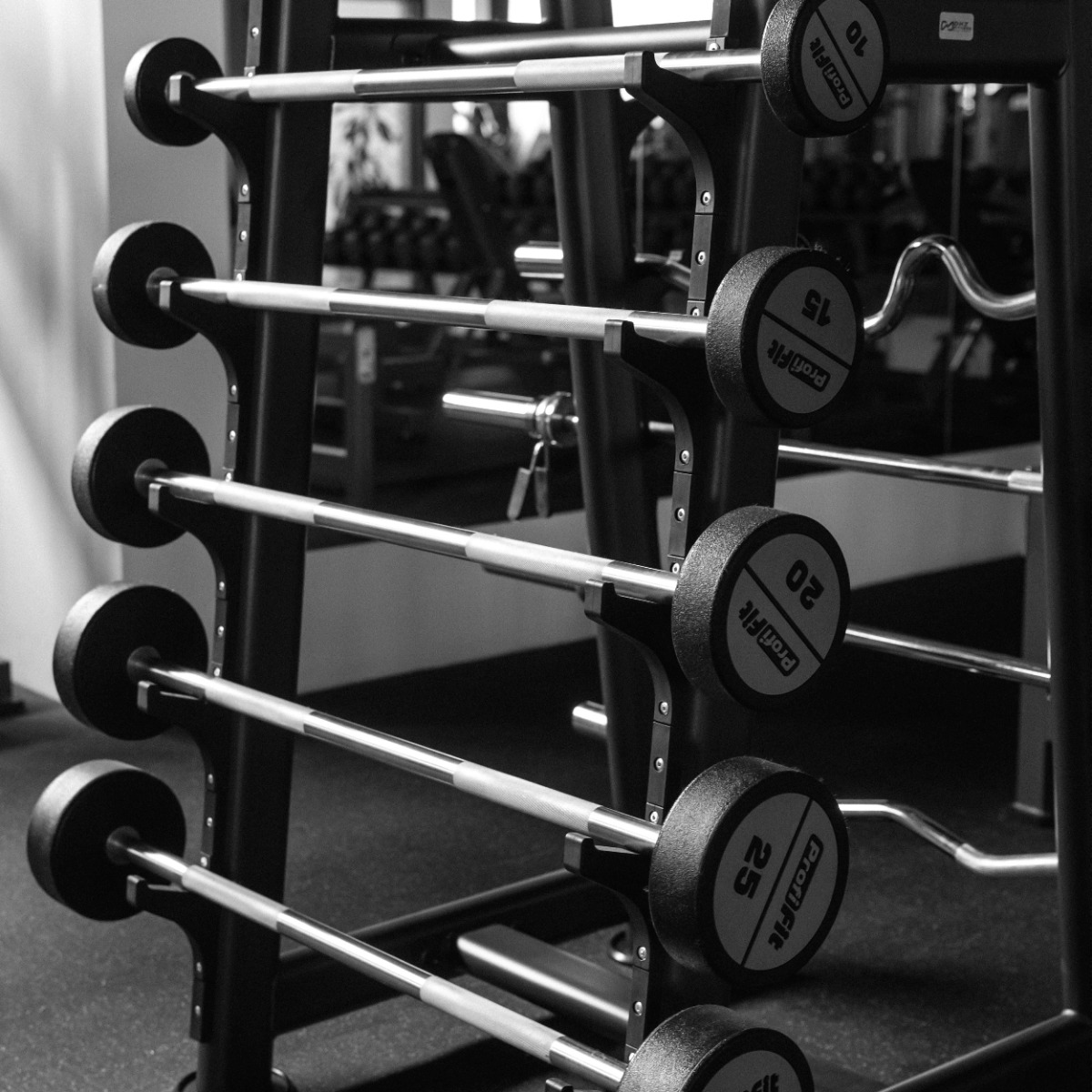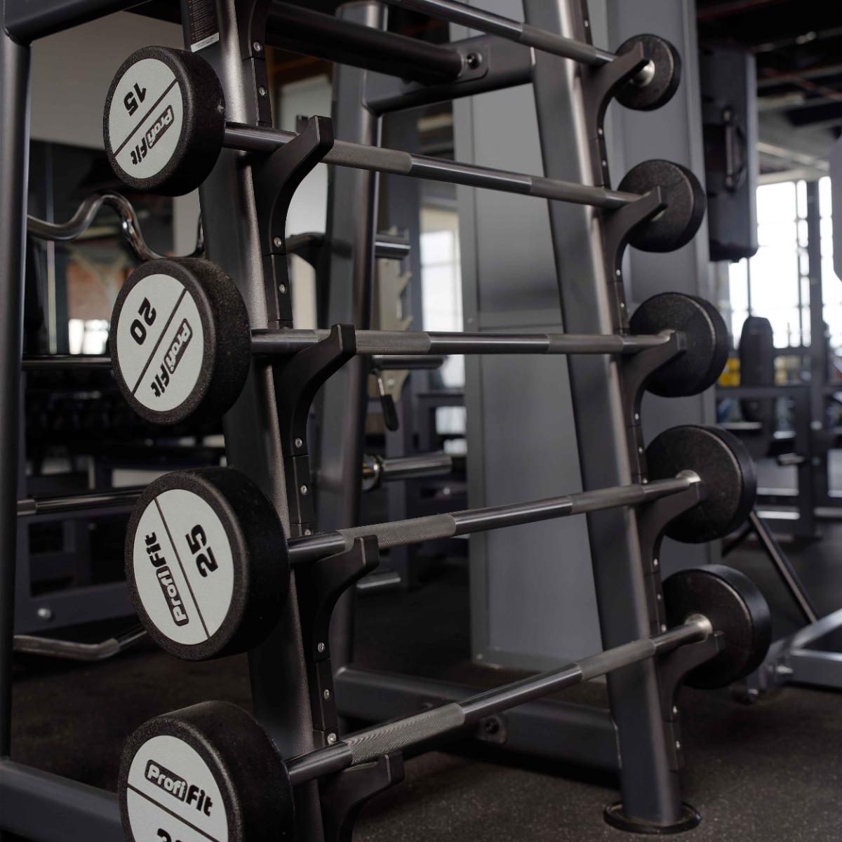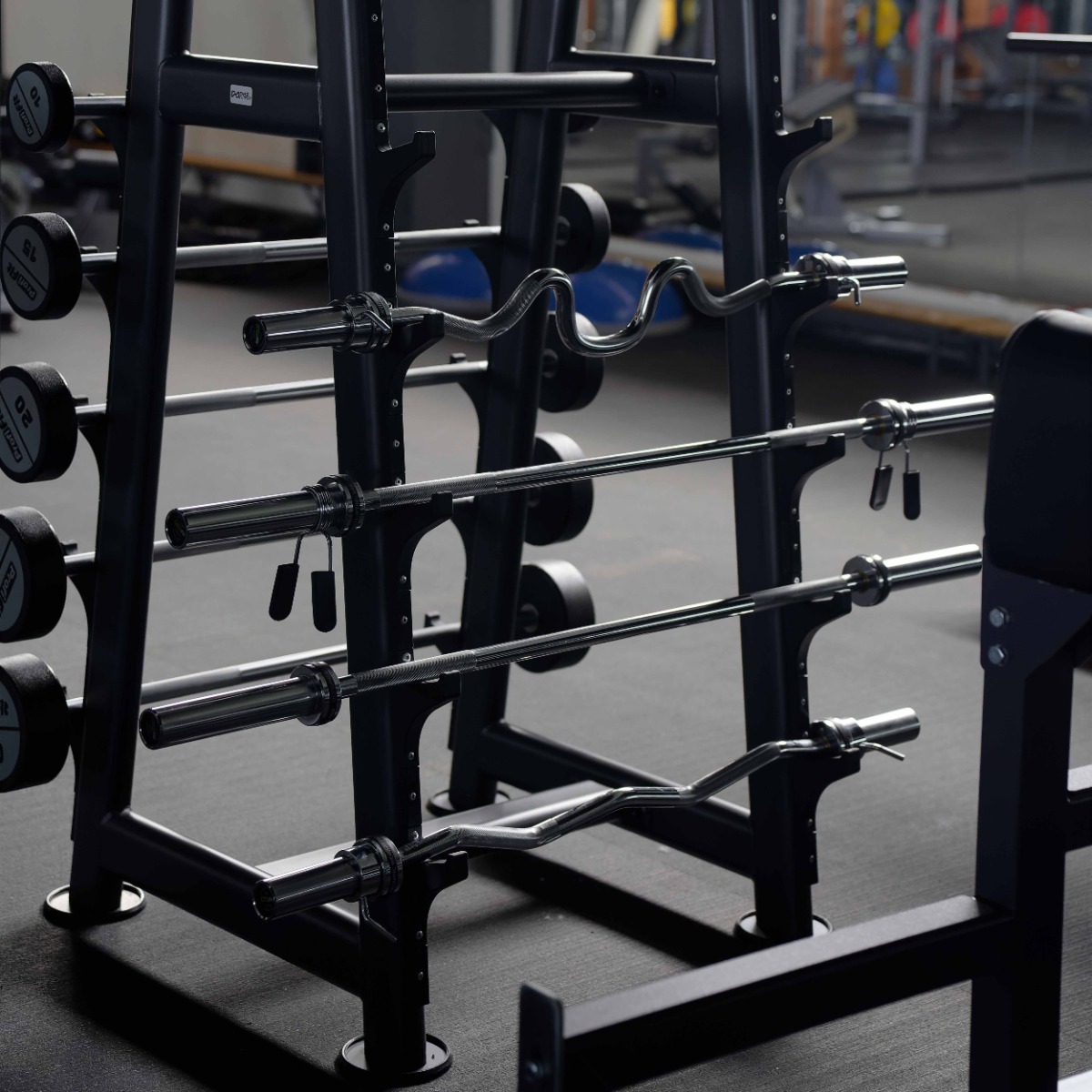 На стойке закреплены пятиуровневые опоры из пластика с двадцатью ложементами для фиксации штанги и предотвращения механического воздействия на раму и покрытие.
