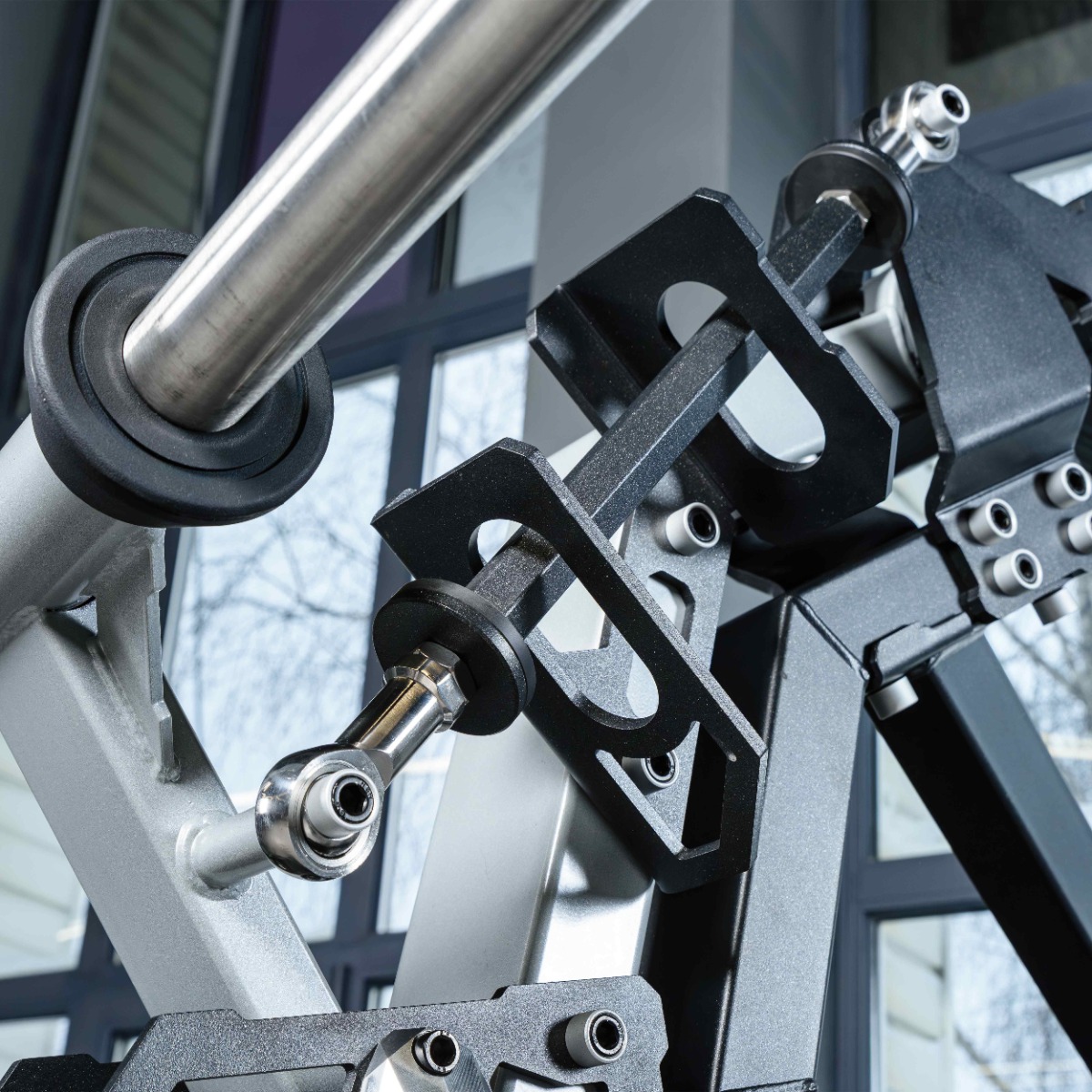 На подвижных рычагах для работы со свободными весами установлено два литых хромированных накопителя из толстостенной стальной трубы для дисков с посадочным диаметром 50 мм.