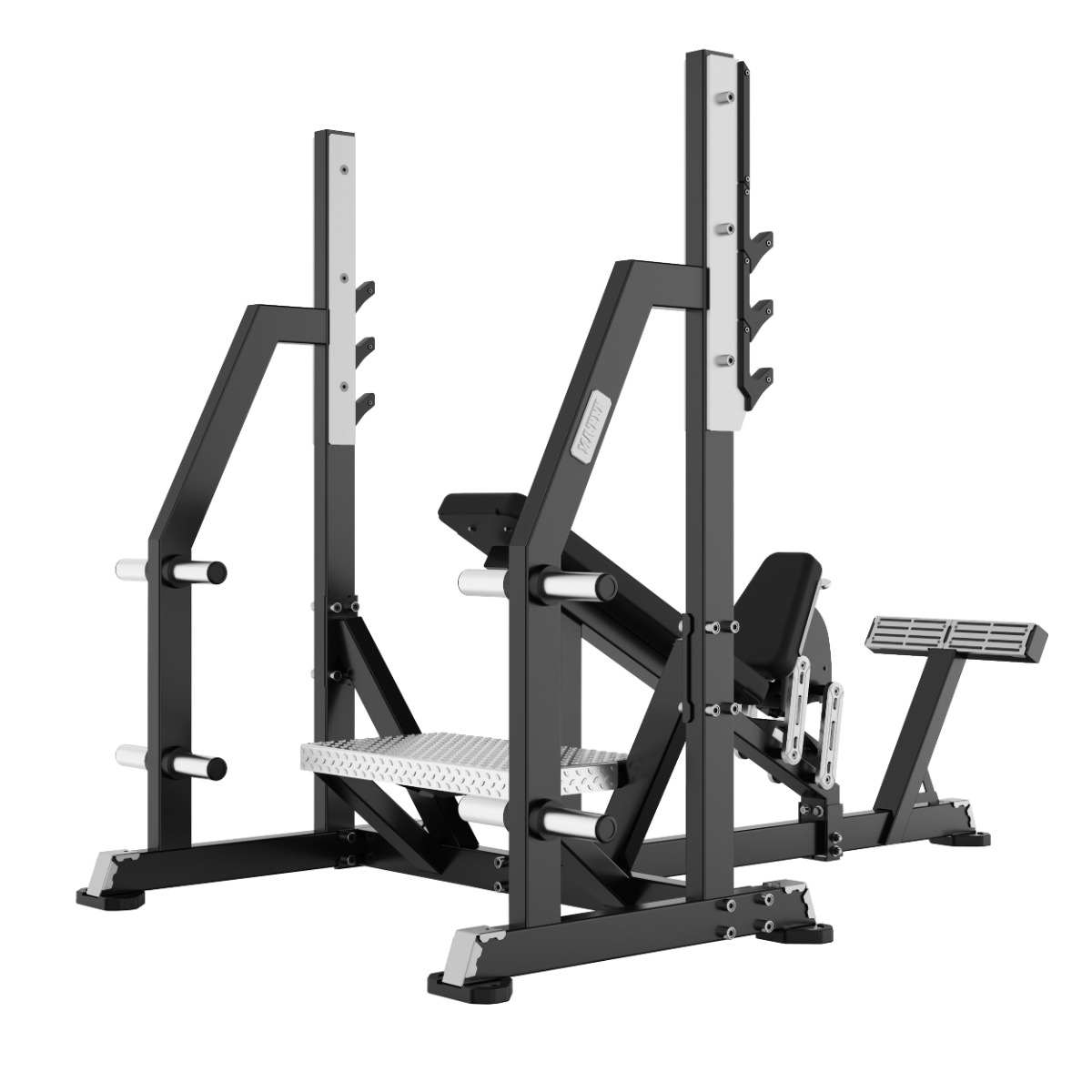 Упор для ног тренирующегося выполнен из металлической профильной трубы с декоративно-защитной накладкой из хромированного листового металла с антискользящими вырезами. Поверхность устойчива к износу, легко очищается и обеспечивает надёжное сцепление стоп во время выполнения упражнения.